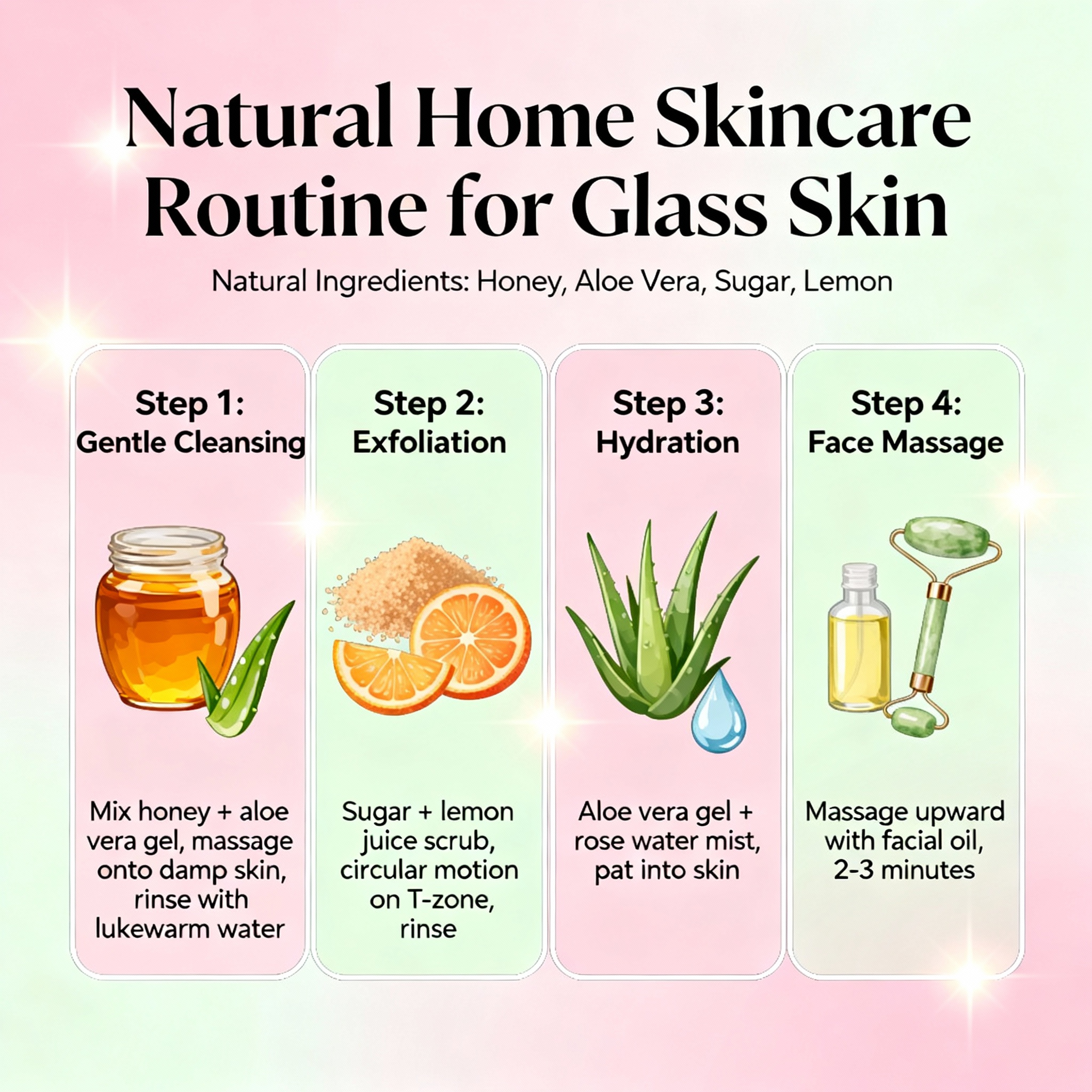 A1: Follow a consistent routine of cleansing, exfoliating, toning, moisturizing, and hydrating using natural ingredients like aloe vera, honey, and green tea.